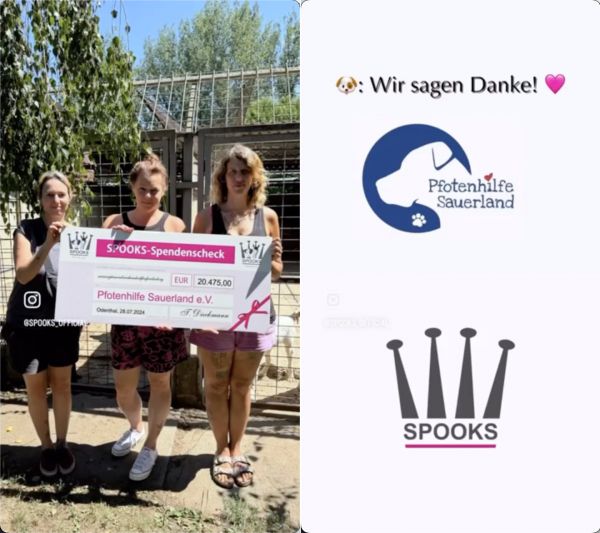 Am 29. Juni 2024 konnte SPOOKS Dank der Sponsoren und fleißigen Helfer die unglaubliche Spendensumme von 20.475 € für die Pfotenhilfe Sauerland verbuchen.