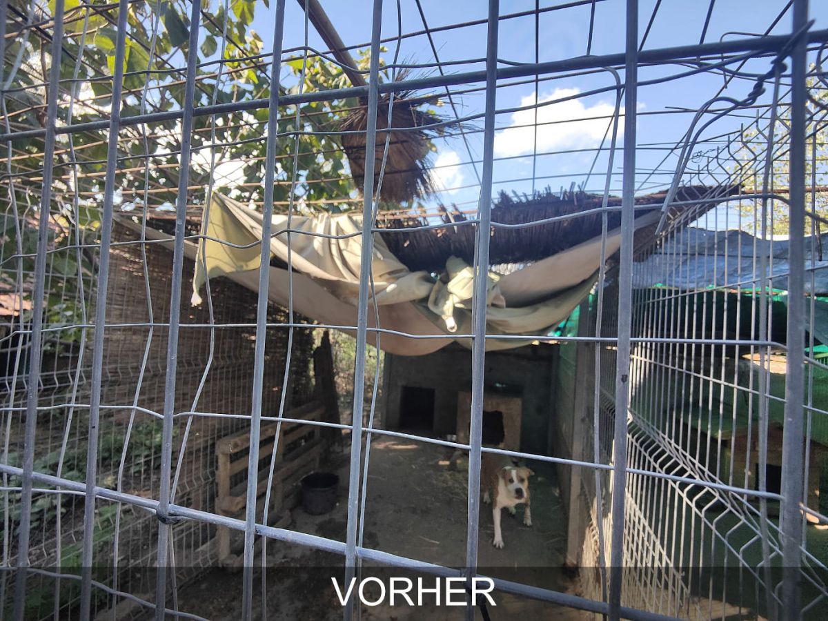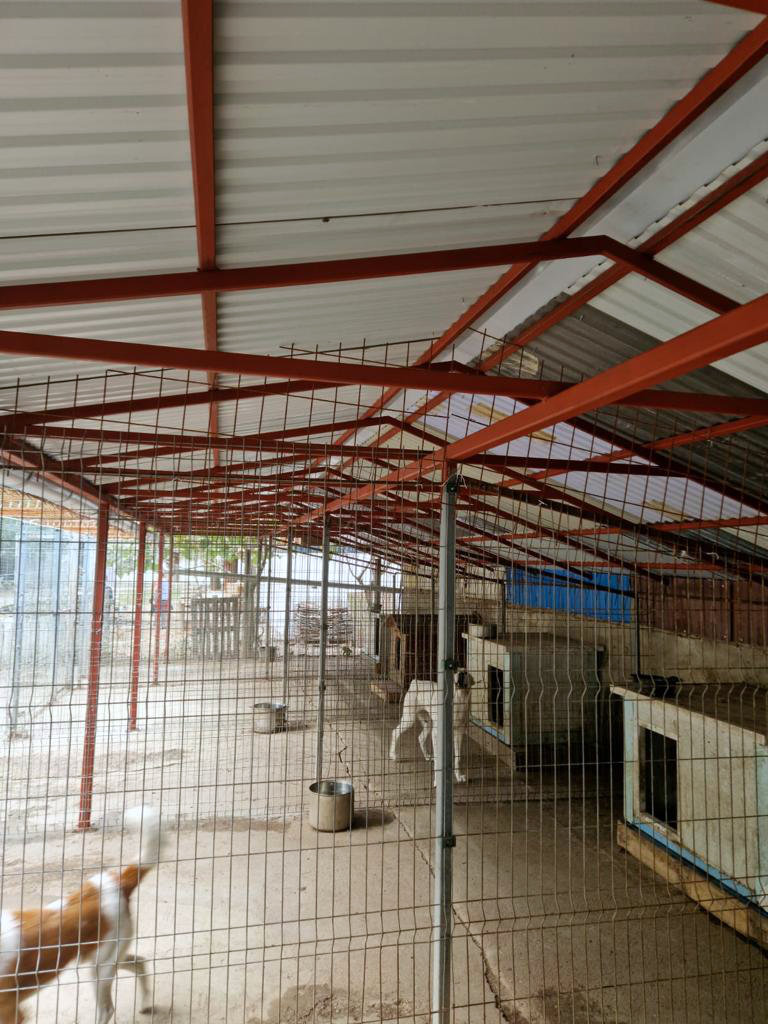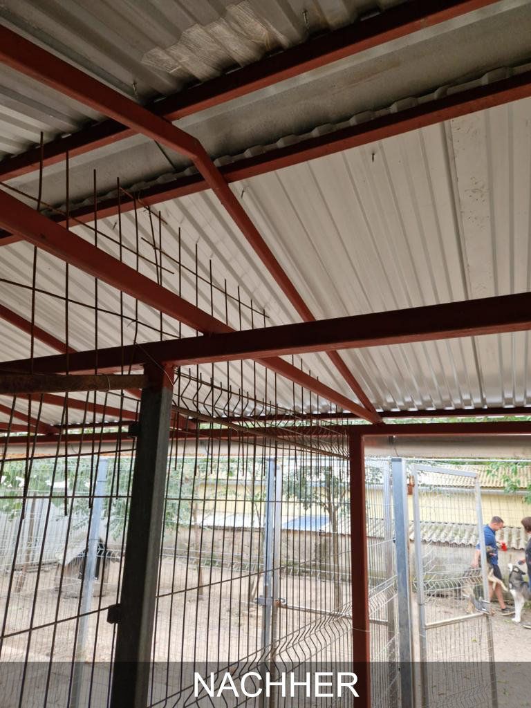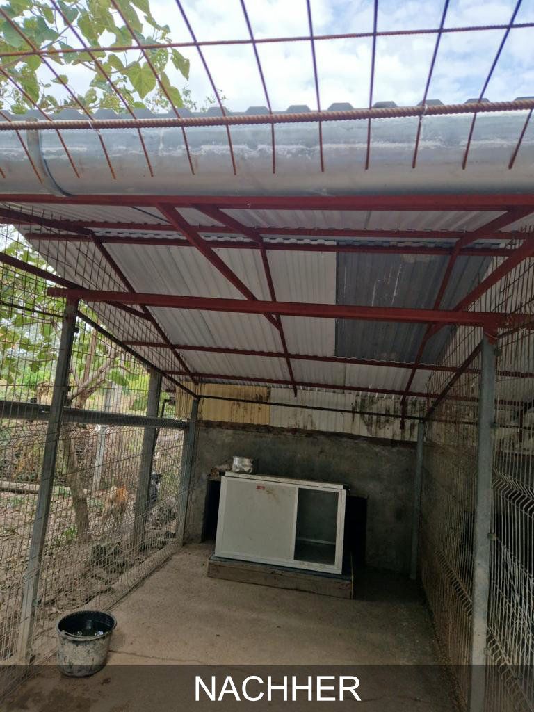 Danke Eurer tollen Spenden konnten die Zwinger neu überdacht werden. Wir sind dankbar und glücklich, dass jetzt, wo die kalte und nasse Jahreszeit unmittelbar bevorsteht, unsere Schützlinge endlich ein Dach über dem Kopf haben und bei Regen wieder geschützt sind.