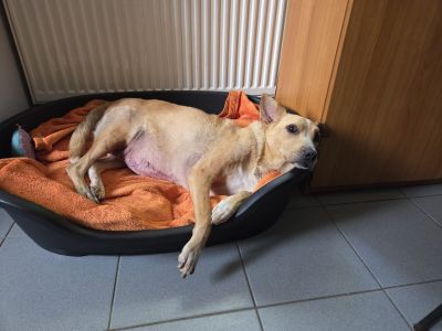 Juno ist seit vielen Jahren bei uns im Tierheim und kam nach einem sehr schweren Autounfall hier her. Unser Orthopäde hat mal wieder ein Wunder vollbracht. Ihr Körper ist voll mit Metall und leider hat Juno noch bei einigen, anderen Krankheiten 'hier' geschrien. Sie ist der Tierheimbürohund und bleibt auch hier.