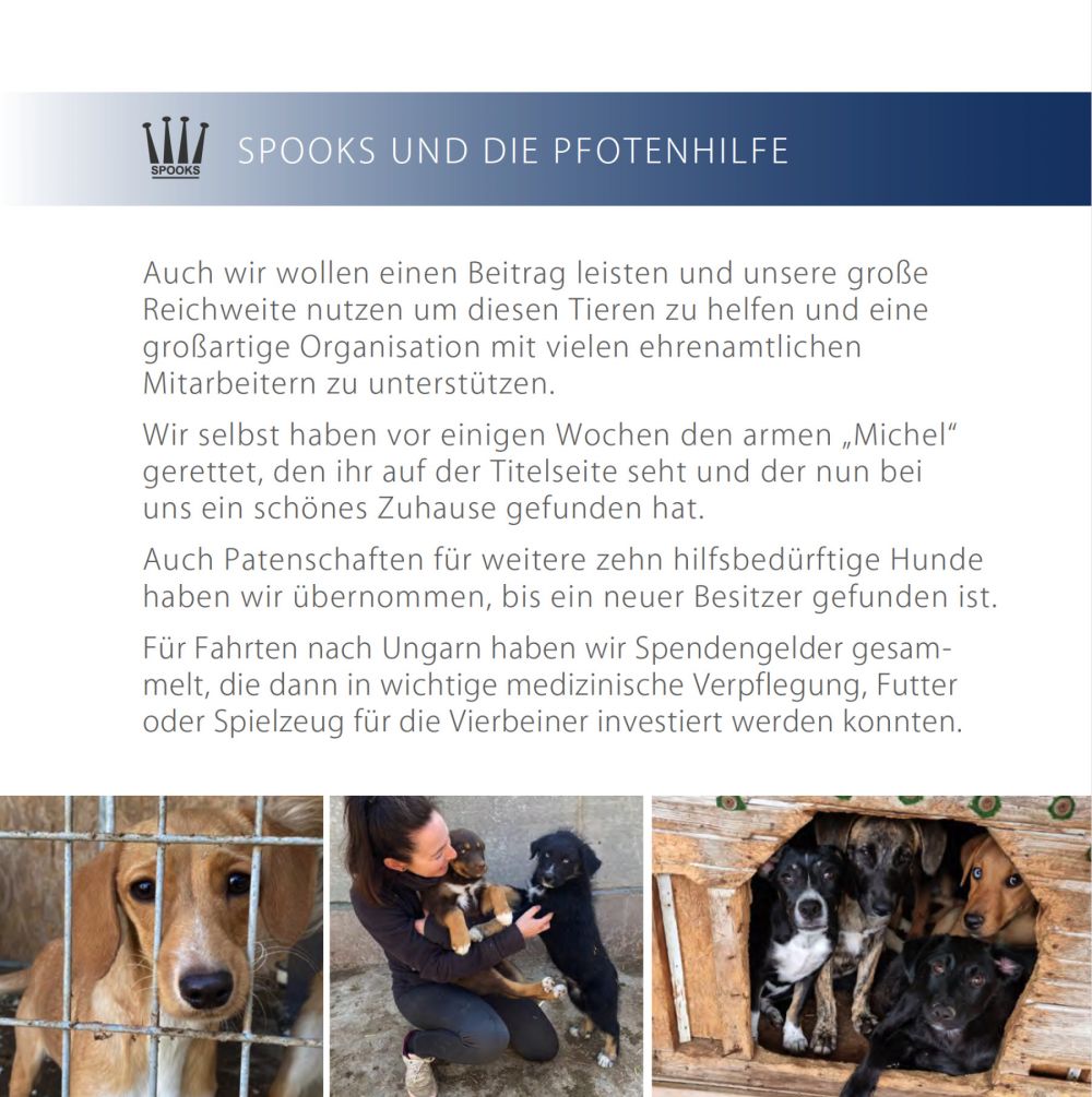 Die „SPOOKS Animal Care“ Charity-Projekte waren unserem Partner immer eine Herzensangelegenheit. Durch Onlinevertriebs- und Messeverkaufsaktionen oder Übernahmen von Patenschaften hat SPOOKS vielen Tieren in Not geholfen und ein Bewusstsein für notleidende Tiere geschaffen.
