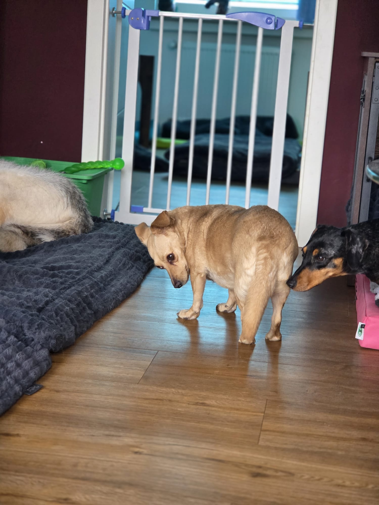 Juno, die ebenfalls im Büro lebt, ist zwar gut verträglich, aber mag keine fremden Menschen und ist territorial. Lambi (Lambada) hat immer mehr Angst bekommen und sich immer mehr versteckt. Und je größer der Stress war, desto mehr hat sie angefangen, sich zu kratzen und zu putzen/lecken.