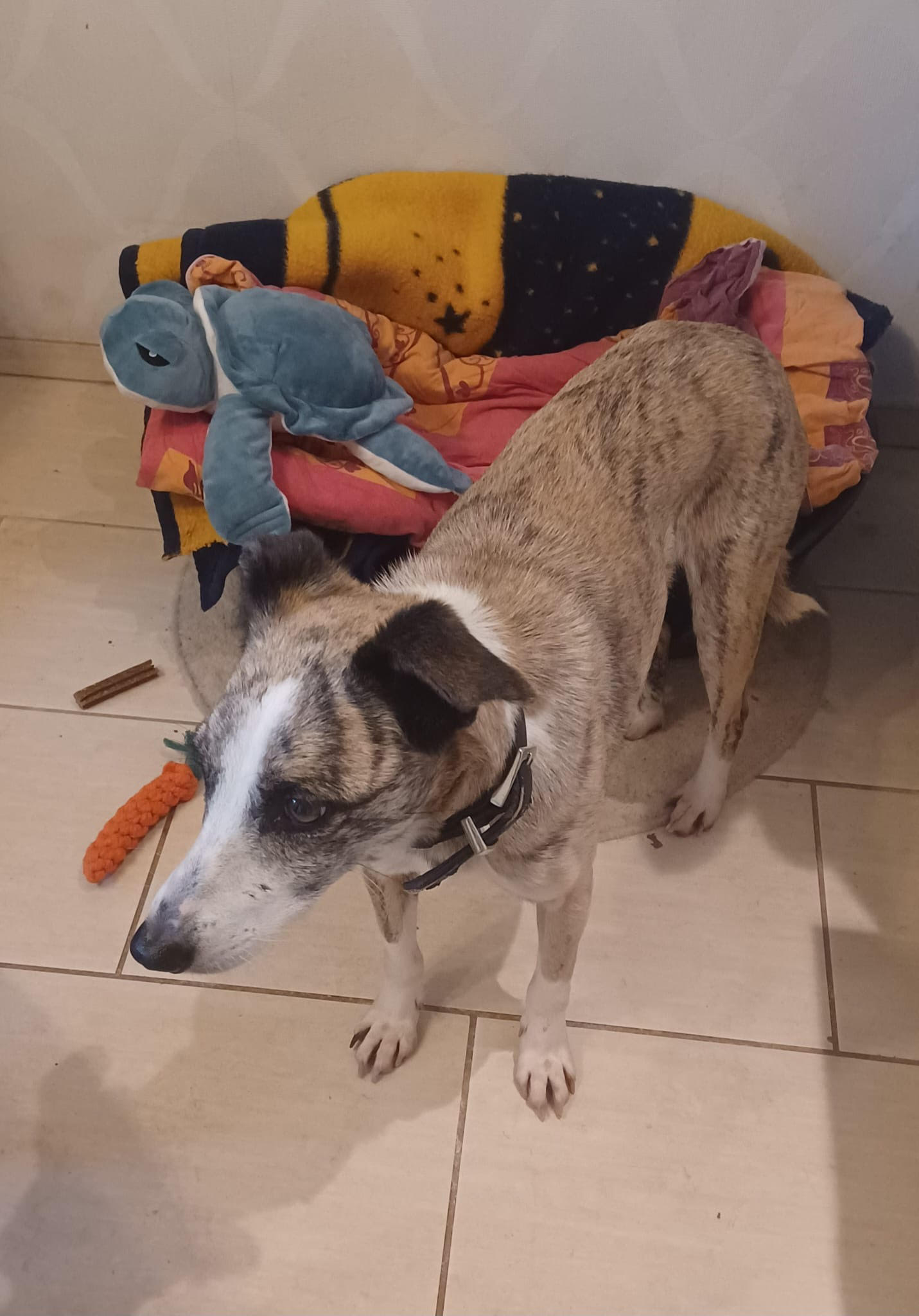 Tigra ist eine sehr sanfte und freundliche Hündin, sie hat sich in ihrer Pflegestelle gut eingelebt. Menschen findet sie allerdings erstmal gruselig weshalb Vertrauensarbeit im neuen Zuhause an erster Stelle stehen sollte. Tigra kann gut alleine bleiben, sie macht nix kaputt.