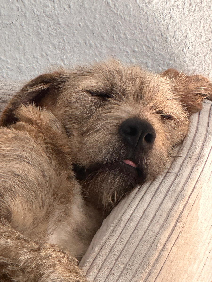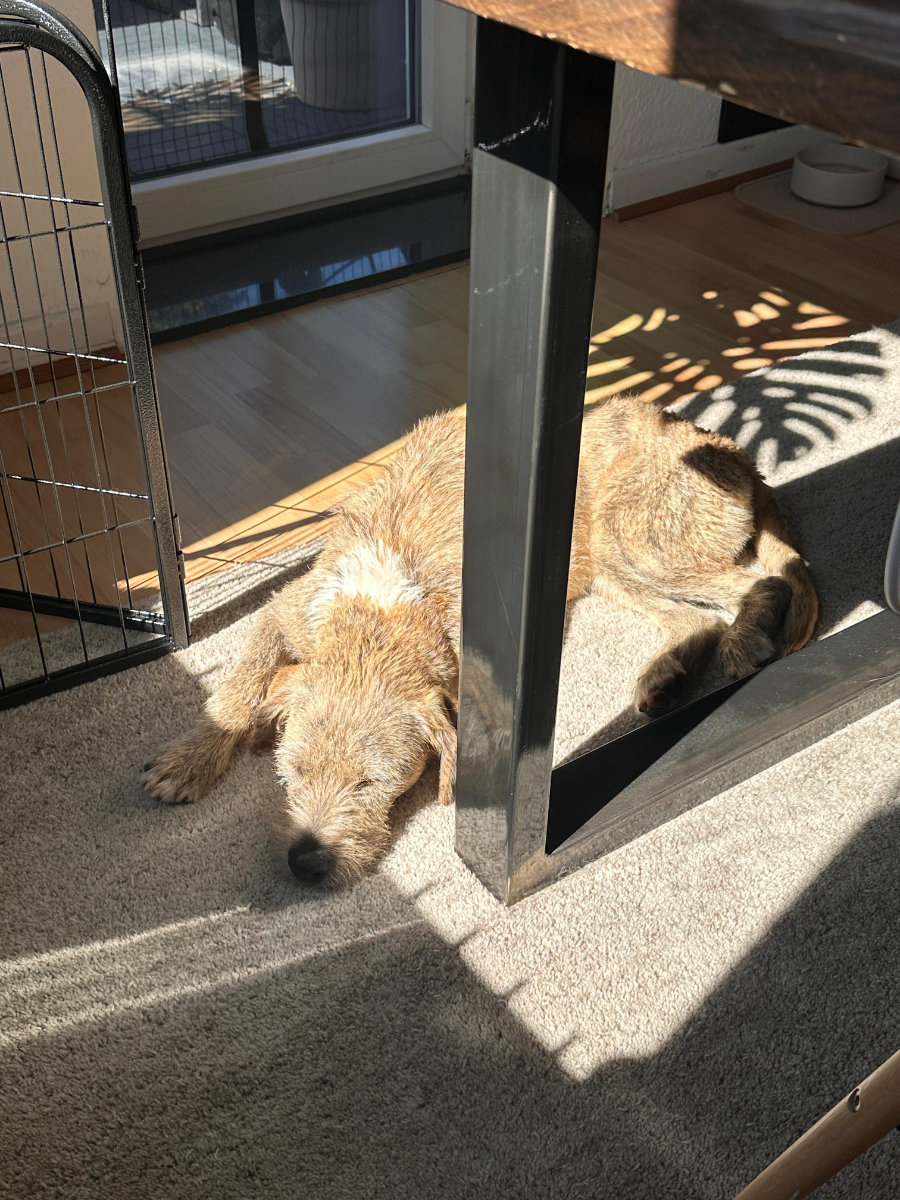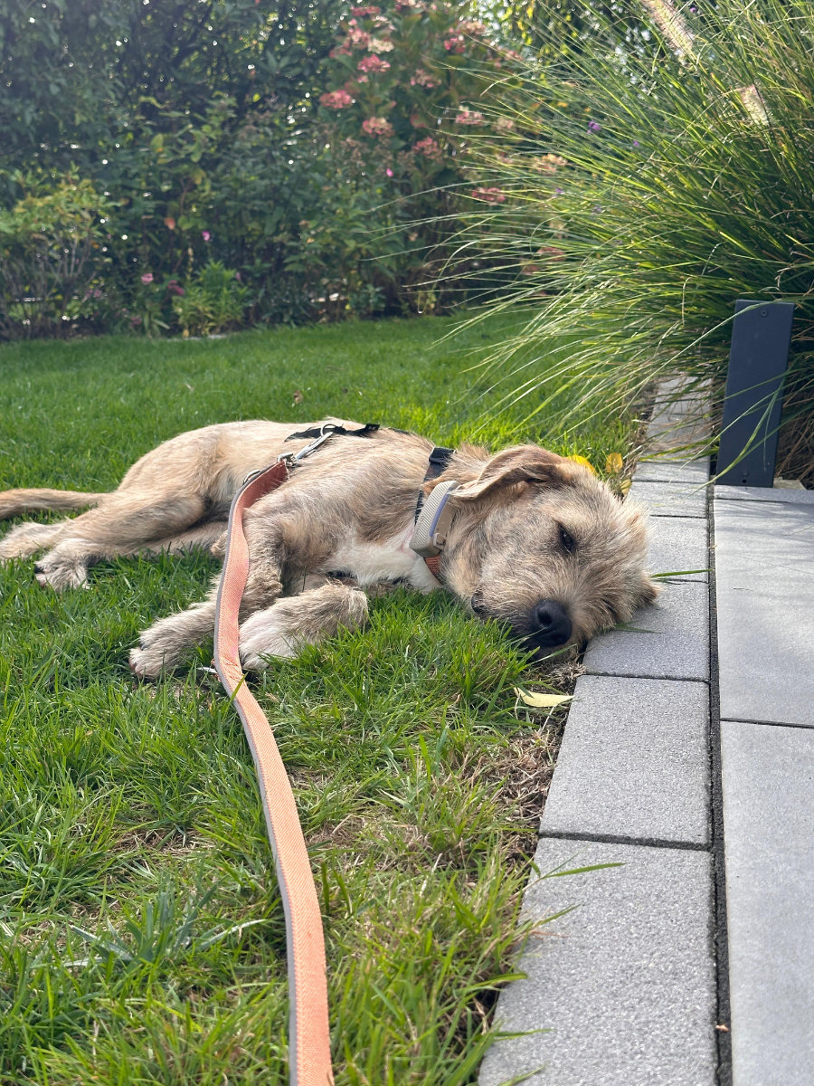 • Nach Spaziergängen schläft sie meist 2-3h, wenn sie Ruhe bekommt. Danach wird dann gerne gespielt und Kommandos trainiert und danach sucht sie gerne wieder ihre Ruhe.