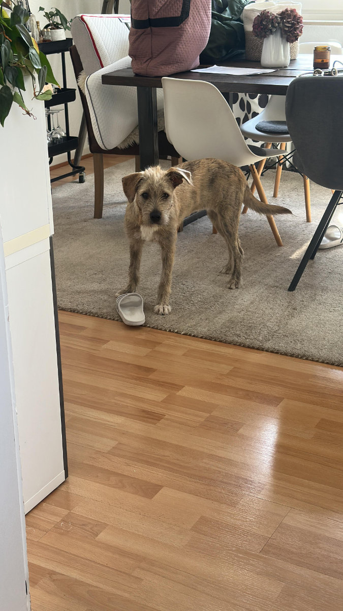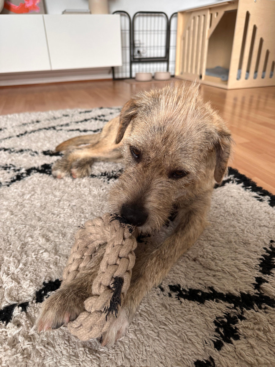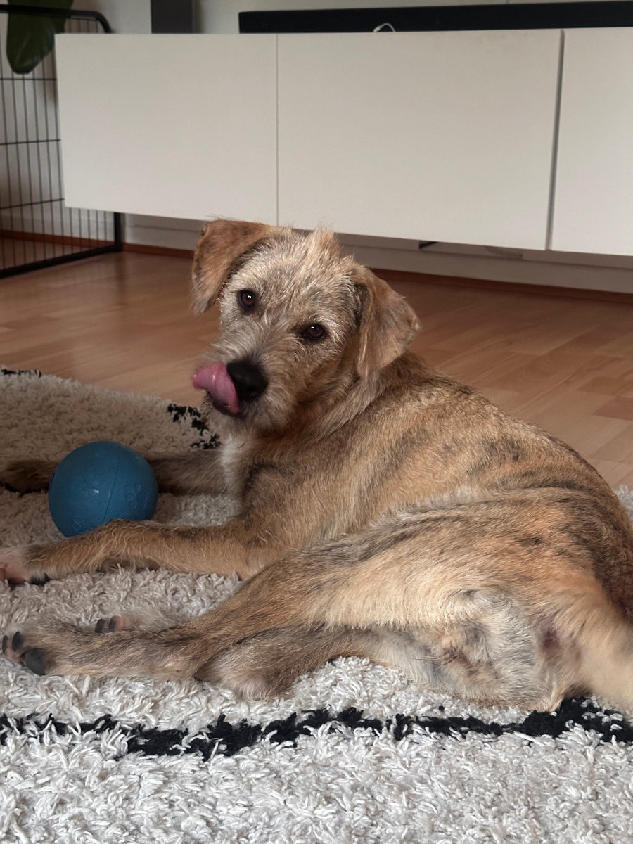 • Alleinbleiben konnte bisher nur teilweise geübt werden. Wenn man sich in der Wohnung mal innerhalb eines anderen Raumes aufhält und ihr die Tür vor der Nase zumacht, ist das kein Problem. Dann schläft sie meistens. Komplett Alleinsein muss noch geübt werden.